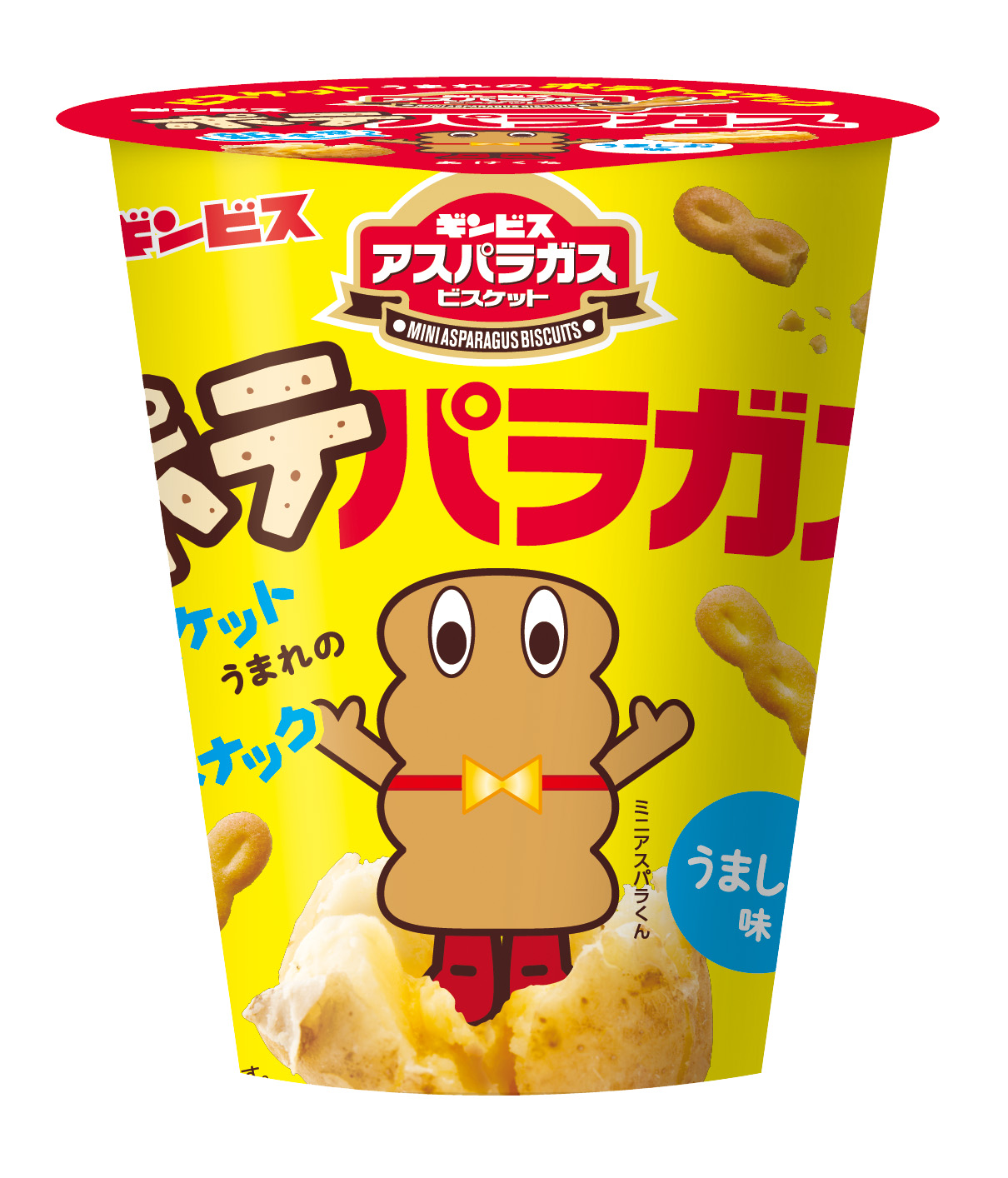 おなじみの「ミニアスパラガスビスケット」とはひと味違う【うましお味】で、ついつい食べてしまうクセになるおいしさをお楽しみいただけます。また、食べやすく、持ち運びしやすいカップ形態にすることで、仕事の合間からレジャーシーンまで、場所を選ばず気軽にお楽しみいただける商品となっています。