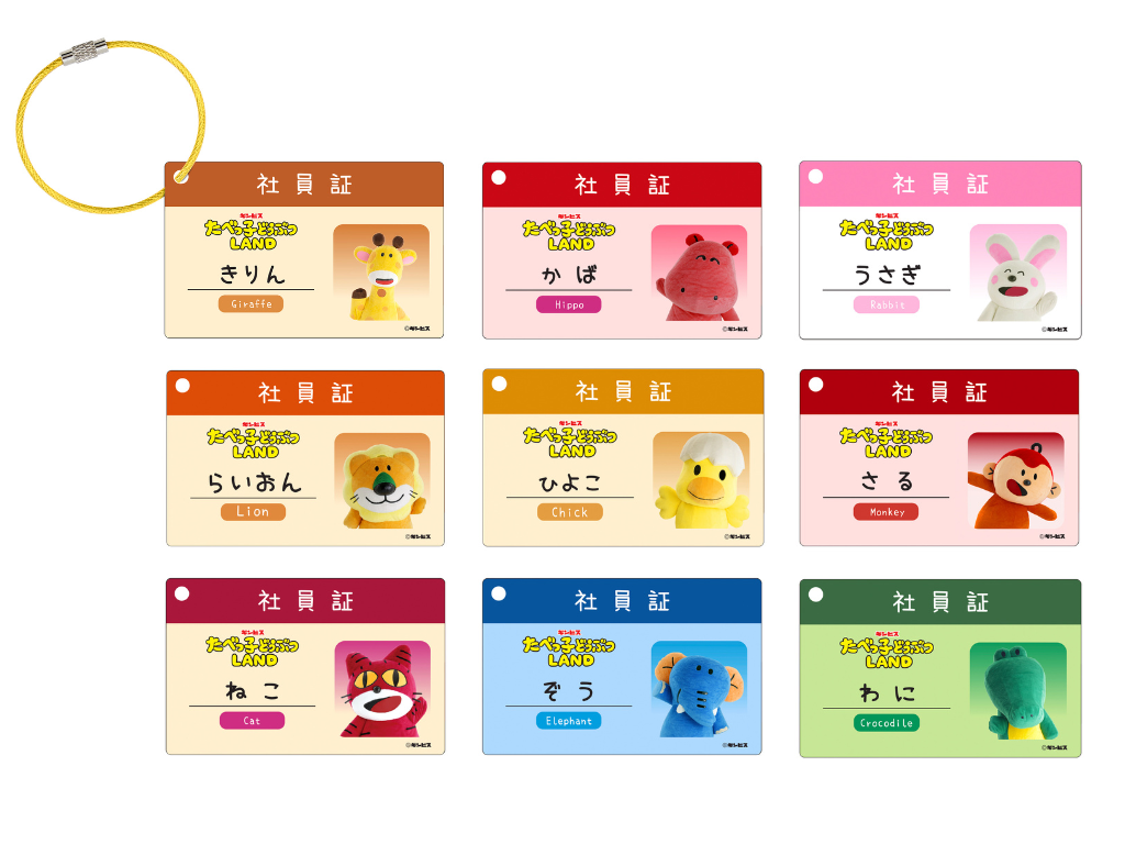 さらに、「たべっ子どうぶつLAND POP UP STORE」内で商品を税込3,000円以上購入すると、どうぶつさんの「社員証(全9種)」をランダムで1点プレゼントするお買い上げ特典もございます(※3)。社員証にはキーリングが付属しており、お好きなアイテムを組み合わせて、自分好みにカスタマイズすることができます。